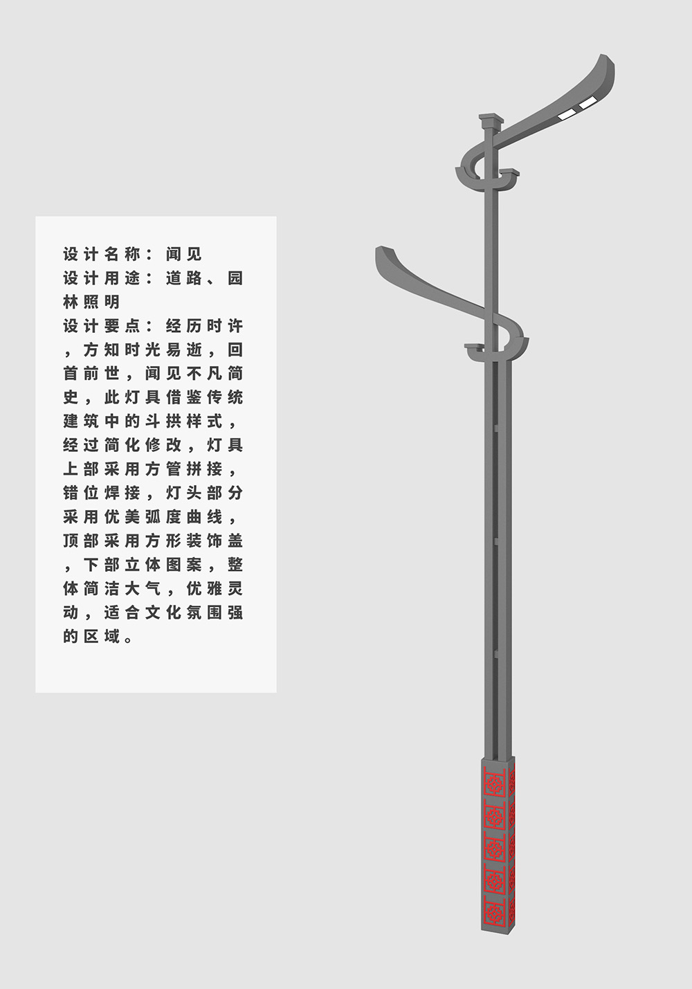 設(shè)計要點:經(jīng)歷時許,方知時光易逝,回首前世,聞見不凡簡史,此燈具借鑒傳統(tǒng)建筑中的斗拱樣式,經(jīng)過簡化修改,燈具上部采用方管拼接,錯位焊接,燈頭部分采用優(yōu)美弧度曲線,頂部采用方形裝飾蓋,下部立體圖案,整體簡潔大氣,優(yōu)雅靈動,適合文化氛圍強的區(qū)域。